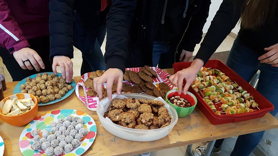 Mizo pri dežurnem dijaku so napolnile raznovrstne dobrote: sadna nabodalca, razni oreščki, jabolčni krhlji, smuti iz borovnic, polnozrnati kruhki, ovseni piškoti ter čokoladne, jabolčne in kokosove presne kroglice. Dijakom smo na ta način približale načela zdravega zajtrka ter jim predale nekaj idej o tem, kakšen naj bi bil zajtrk, ki je navsezadnje najpomembnejši dnevni obrok, saj zjutraj telo oskrbi s potrebno energijo in hranilnimi snovmi, ki jih potrebujemo tekom dneva.